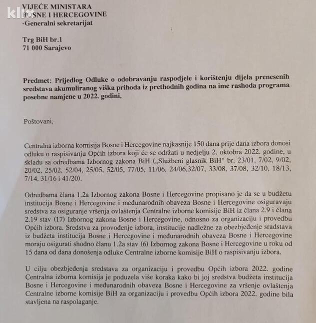 CIK u svom zahtjevu traži da Vijeće ministara izdvoji novac iz budžetske rezerve, odnosno od prenesenih sredstava iz prethodnih godina.