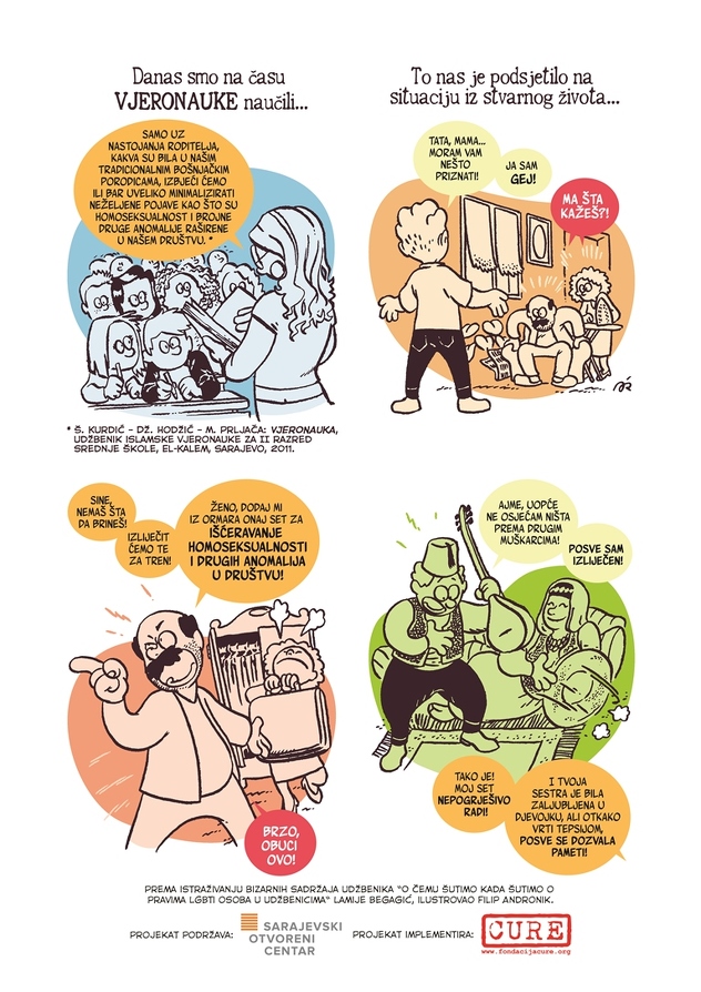 Fondacija CURE, u partnerstvu sa Sarajevskim otvorenim centrom, implementira projekat "Korištenje procesa EU integracija za poboljšanje LGBT prava na Zapadnom Balkanu". Kroz strip ovaj put ukazuje na diskriminirajuće sadržaje školskih udžbenika za srednje škole u Kantonu Sarajevo.