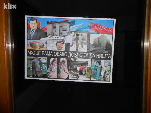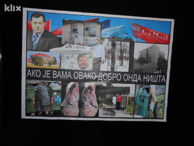 Predsjednik SNSD-a Milorad Dodik na ovim je plakatima prikazan kao čovjek koji uživa u izobilju, u vilama, vikendicama, novcu, avionima... Suprotno od toga, na donjem dijelu plakata prikazani su građani koji rove po kontejnerima. Pored jednog od kontejnera je i žena u promotivnoj majici SNSD-a, čija se fotografija prije nekoliko dana brzo proširila društvenim mrežama.
