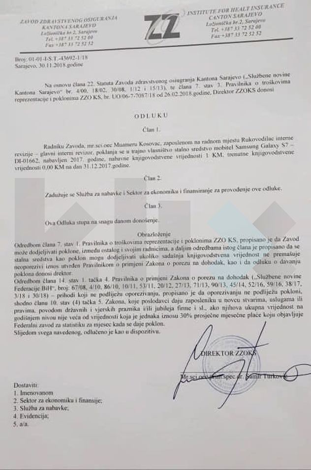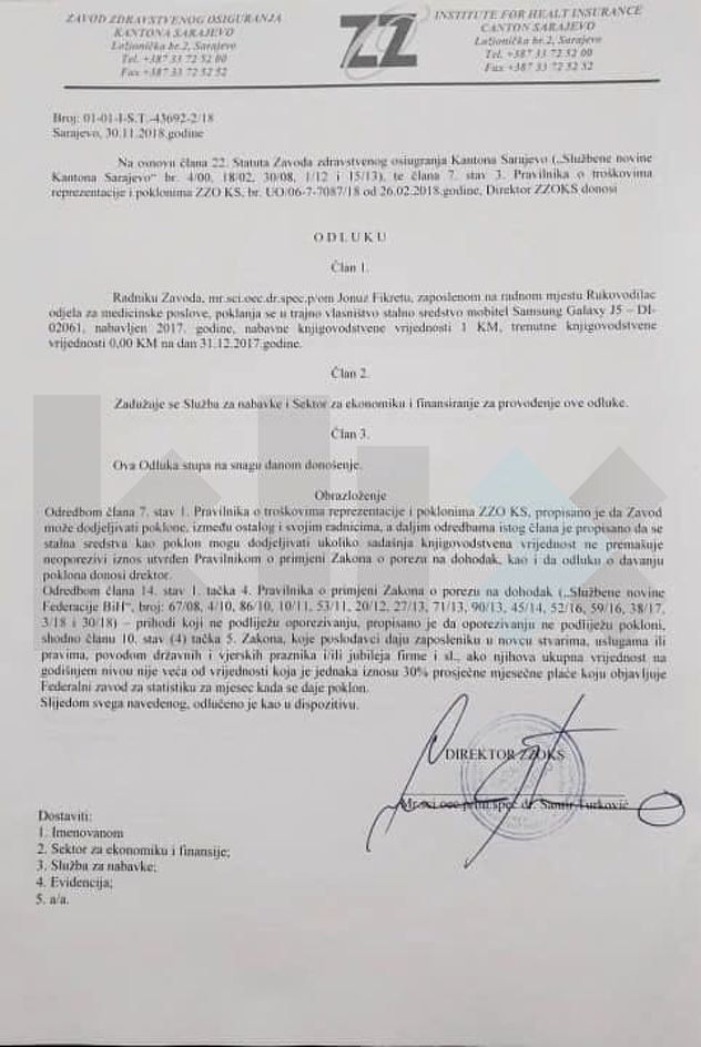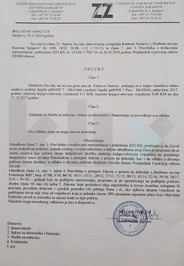 "Direktoru Zavoda zdravstvenog osiguranja KS Samiru Turkoviću poklanja se na trajno vlasništvo stalno sredstvo mobitel Apple iPhone 7 i mobitel Apple iPhone 7 Plus, nabavljeni 2017. godine, nabavne knjigovodstvene vrijednosti 1+1 KM, trenutne knjigovodstvene vrijednosti 0,00 KM na dan 31. decembar 2017. godine", piše u odluci donesenoj 30. novembra 2018. godine, a koju potpisuje predsjednik Upravnog odbora Zavoda zdravstvenog osiguranja KS Hamid Milak.