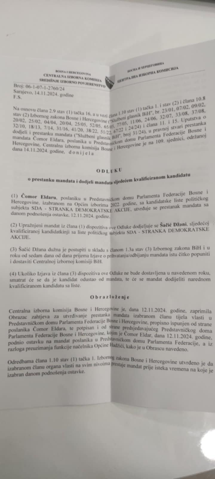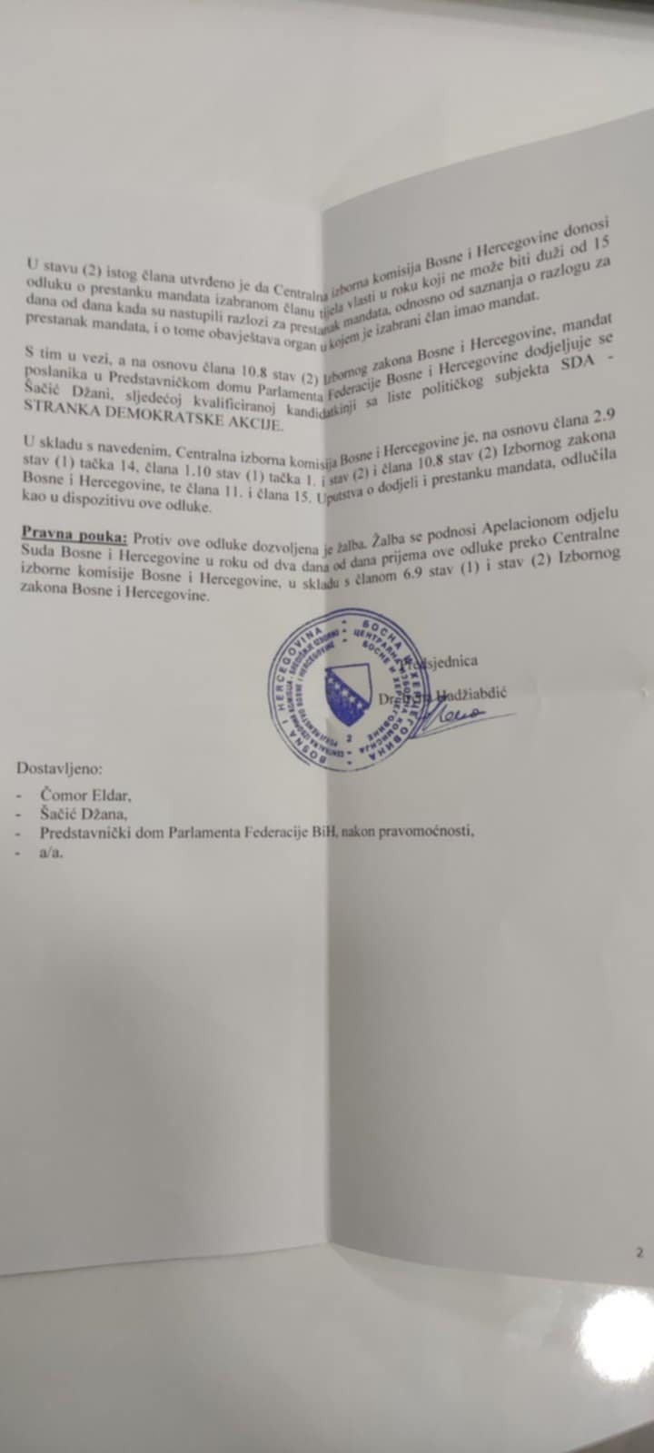 CIK je odlučio da Čomorov mandat bude dodijeljen sljedećem kandidatu, odnosno Džani Šačić. Ovu informaciju je za Klix.ba potvrdio Čomor.
