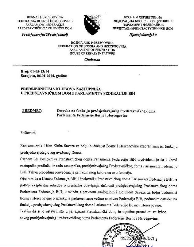 Takva procedura provedena je prilikom mog izbora nu ovu funkciju. Obzirom da u Ustavu Federacije BiH i Poslovniku Predstavničkog doma Parlamenta FBiH ne postoji eksplicitna odredba o prestanku obavljanja dužnosti predsjedavajućeg Predstavničkog doma Parlamenta FBiH, u skladu s pravnom analogijom i Odlukom Saveza za bolju budućnost BiH o izlasku iz parlamentarne većine na nivou Federacije BiH, podnosim ostavku na funkciju predsjedavajućeg Predstavničkog doma Parlamenta Federacije BiH.