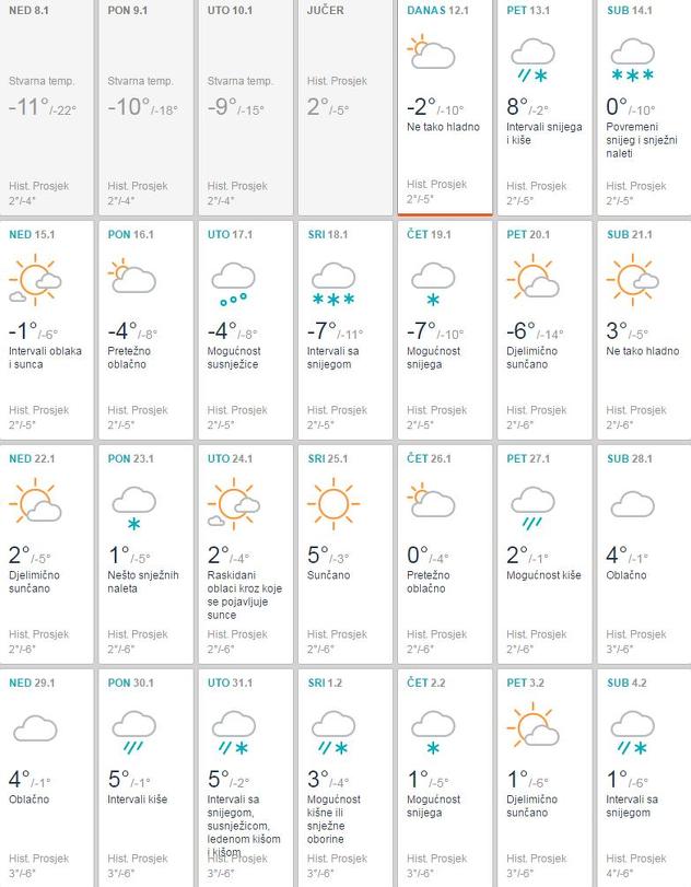 Slično vrijeme bit će i u nedjelju. Krajem dana i u večernjim satima u Hercegovini očekuju se kiša i susnježica, a u centralnim, istočnim i zapadnim područjima Bosne i snijeg. Jutarnje temperature bit će od -13 do -6 stepeni celzija, a dnevne od -6 do 0, na jugu od 1 do 6 stepeni.