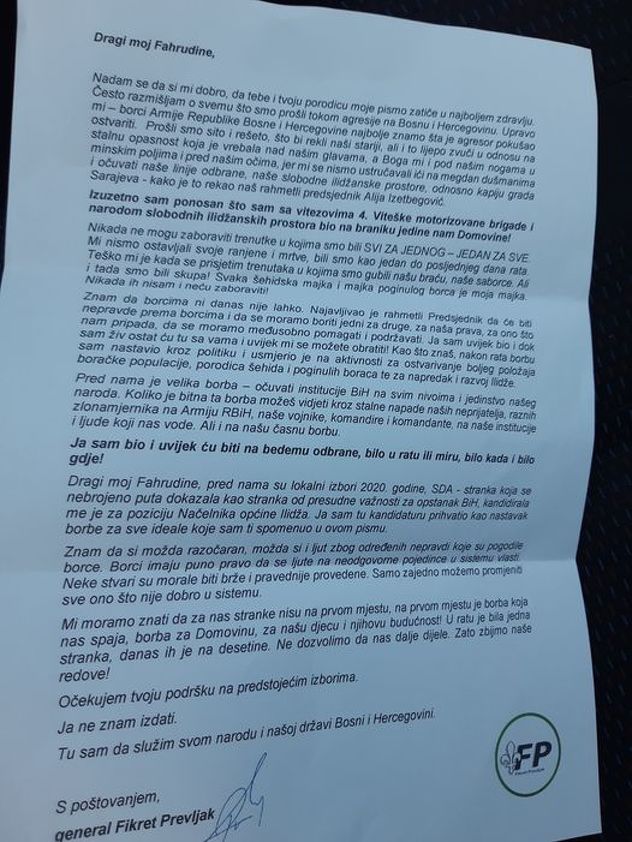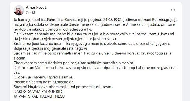"Da ti kažem generale, moj babo bi glasao za vas, jer je bio borac, volio svoj narod i zemlju, kažu mi da je bio dobar čovjek, pošten vrijedan, jer ga se ja slabo sjećam. Sretnu me ljudi kažu da imam lika njegovog, a meni je u životu samo ostalo par slika njegovih. Bolje se ja sjećam moj generale rata nego vi. Sjećam se kad mi je babo rahmetli ranjen, kad su ga unijeli u dnevni boravak krvavog, toga se ja sjećam. Zbog vas sam samo doživio poniženja kao šehidska porodica, ništa više. Dolazio sam vam i kući, i tražio vas i u opštini da vam objasnim zašto moj babo ne može glasati za vas. Ukopan je i haremu ispred džamije. Pustite ga barem na miru, pustite ga", napisao je.