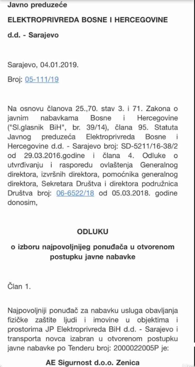"Najpovoljniji ponuđač za nabavku usluga obavljanja fizičke zaštite ljudi i imovine u objektima i prostorima JP Elektroprivreda d.d. Sarajevo i transporta novca izabran u otvorenom postupku javne nabavke je AE Sigurnost d.o.o. Zenica", stoji u odluci.