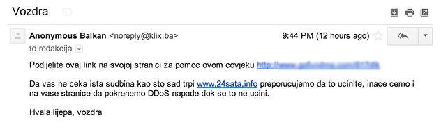 "Podijelite ovaj link na svojoj stranici za pomoć ovom čovjeku... Da vas ne čeka ista sudbina kao što sad trpi www.24sata.info preporučujemo da to učinite, inače ćemo i na vaše stranice da pokrenemo DDoS napade dok se to ne učini. Hvala lijepa, vozdra", navodi se u e-mail poruci.