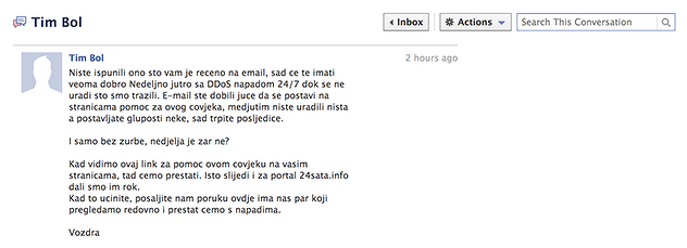 "Niste ispunili ono što vam je rečeno na email, sad će te imati veoma dobro Nedeljno jutro sa DDoS napadom 24/7 dok se ne uradi što smo tražili. E-mail ste dobili juče da se postavi na stranicama pomoć za ovog čovjeka, međutim niste uradili ništa a postavljate gluposti neke, sad trpite posljedice. I samo bez žurbe, nedjelja je zar ne? Kad vidimo ovaj link za pomoć ovom čovjeku na vašim stranicama, tad ćemo prestati. Isto slijedi i za portal 24sata.info dali smo im rok. Kad to učinite, pošaljite nam poruku ovdje ima nas par koji pregledamo redovno i prestat ćemo s napadima. Vozdra", napisao je haker na našoj Facebook stranici.