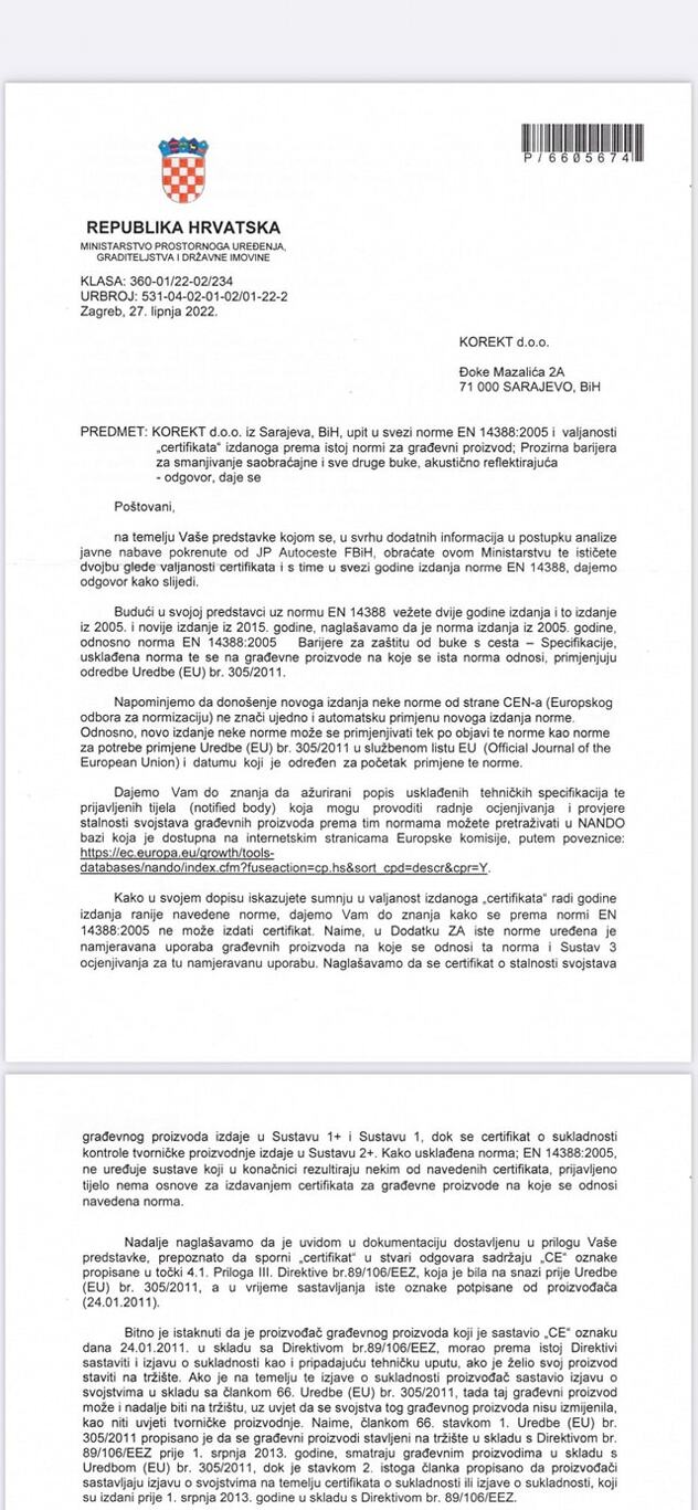 U svojoj žalbi, advokat Davor Bunoza dostavlja i navodni akt Ministarstva prostornog uređenja, graditeljstva i državne imovine Republike Hrvatske u kojem je navedeno da se sporni certifikat iz 2005. godine, koji je priložio konzorcij Coning-Euroasfalt ne koristi.