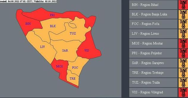 U 8 sati jutros u Mostaru je izmjereno čak 27 stepeni celzija dok su u ostalim gradovima zabilježene sljedeće temperature: Bugojno, Goražde, Sokolac i Srebrenica 17, Ivan Sedlo i Sarajevo 18, Kupres 19, Bihać i Tuzla 20, Banja Luka, Livno, Sanski Most, Zenica i Zvornik 21, Bijeljina, Doboj i Stolac 22, Čapljina 24, Gradačac i Trebinje 25 i Neum 26 stepeni celzija.