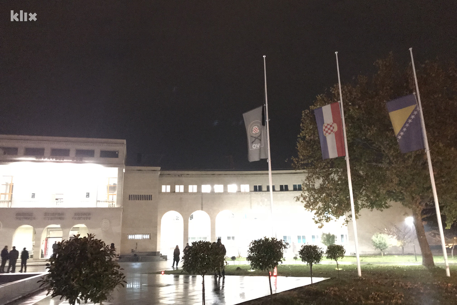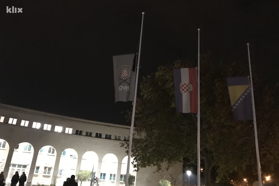 Ispred doma su postavljene zastave Bosne i Hercegovine, zastava hrvatskog naroda i Hrvatskog vijeća obrane i sve su spuštene na pola koplja.