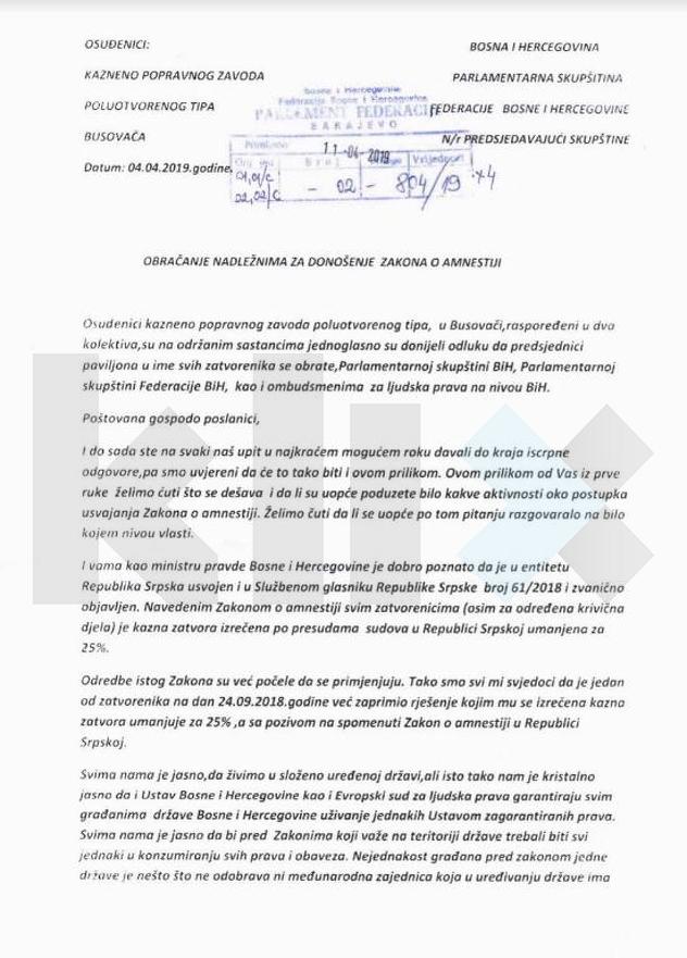 U Parlamentarnu skupštinu Bosne i Hercegovine i Parlament Federacije Bosne i Hercegovine, u čijem rukovodstvu su Borjana Krišto i Elvir Karajbić, stiglo je pismo iz Kazneno-popravnog zavoda poluotvorenog tipa Busovača, a koje potpisuju "ovlašteni zastupnici", odnosno predsjednici I i II paviljona.