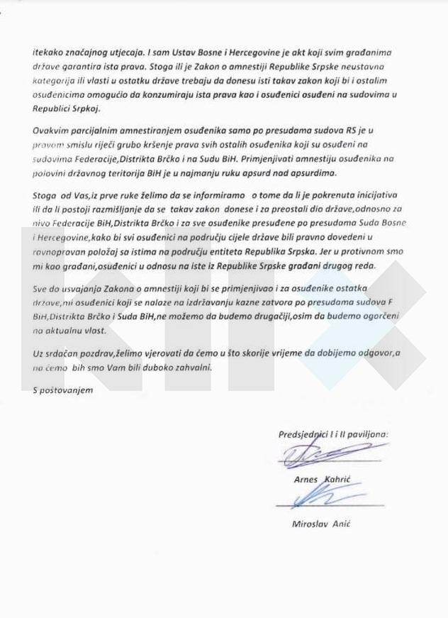"I vama, kao i ministru pravde BiH, dobro je poznato da je u entitetu Republika Srpska usvojen i u Službenom glasniku RS i zvanično objavljen Zakon o amnestiji. Navedenim zakonom svim zatvorenicima, osim za određena krivična djela, je kazna zatvora izrečena po presudama sudova u RS umanjena za 25 posto", konstatovali su predsjednici zatvorenika.