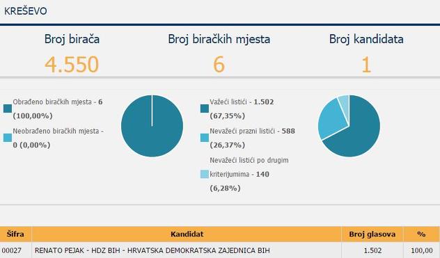 Kandidat Hrvatske demokratske zajednice BiH za načelnika Općine Kreševo Renato Pejak na jučerašnjim lokalnim izborima nije imao konkurencije. Stoga mu je pošlo za rukom da osvoji 100 posto glasova.