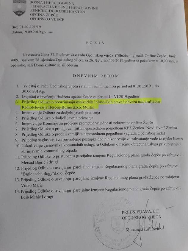 Naredni četvrtak bit će održana sjednica Općinskog vijeća Općine Žepče, a na kojoj je kao treća tačka dnevnog reda stavljen Prijedlog odluke o preuzimanju osnivačkih i vlasničkih prava i obaveza nad društvom Radio-televizija Herceg-Bosne d.o.o. Mostar. Dnevni red s ovom tačkom potpisuje predsjedavajući Općinskog vijeća Općine Žepče Muhamed Jusufović iz SDA.