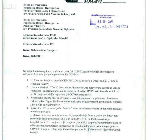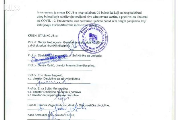 "Napominjemo da je to 95 posto proširenih postojećih kapaciteta i tokom cijelog dana primamo pacijente sa koronom koji ne zahtijevaju kisik i koji bi se morali liječiti u Općoj bolnici. Istovremeno, na KCUS-u je hospitalizirano 36 bolesnika koji su hospitalizirani zbog bolesti koje zahtijevaju tercijarnu zaštitu, a i pozitivni su na koronu", zaključuje se u dokumentu kojeg potpisuje direktorica KCUS-a Sebija Izetbegović.