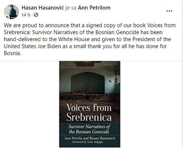 "Ponosni smo što možemo objaviti da je potpisani primjerak naše knjige 'Glasovi iz Srebrenice: Narativi preživjelih bosanskog genocida' ručno dostavljen Bijeloj kući i uručen predsjedniku Sjedinjenih Država Joeu Bidenu", objavili su autori.