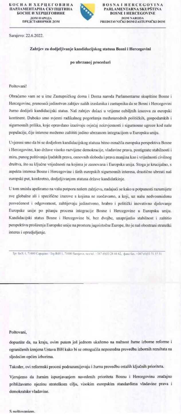 "Poštovani, dopustite da na kraju, ovim putem još jednom ukažemo na naužnost žurne izborne reforme i ograničenih izmjena Ustava BiH kako bi se omogućila neposredna provedba izbornih rezultata na sljedećim općim izborima. Također, ovi reformski procesi podrazumijevaju i žurnu provedbu ostalih ključnih prioriteta. Vjerujemo da hitnim ispunjavanjem prioriteta BiH znatno približavamo njenom strateškom cilju, visokim evropskim standardima vladavine prava i demokratske vladavine", navedeno je na kraju pisma.