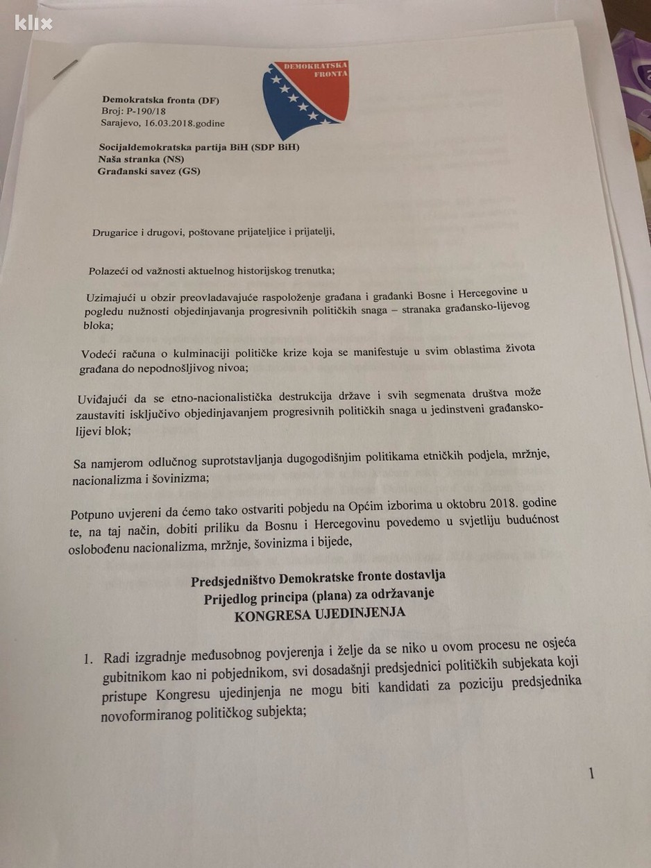 Ono što je jučer za Klix.ba potvrdio predsjednik Demokratske fronte Željko Komšić to je danas i uradio. SDP-u, Našoj stranci i GS-u je poslao prijedlog da ugase postojeće stranke i formiraju novu zajedničku stranku s kojom će izaći na izbore.