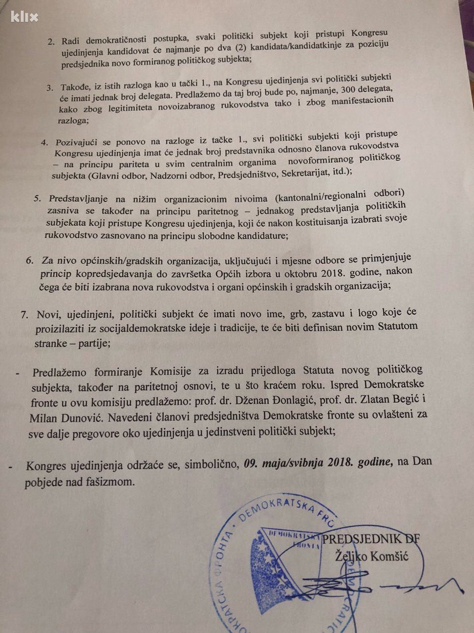 U Komšićevom pismu se predlaže da svaka stranka ima pravo kandidovati po dva člana za pozicije predsjednika nove partije. To je predloženo na osnovu jučerašnjeg zaključka Predsjedništva DF-a.
