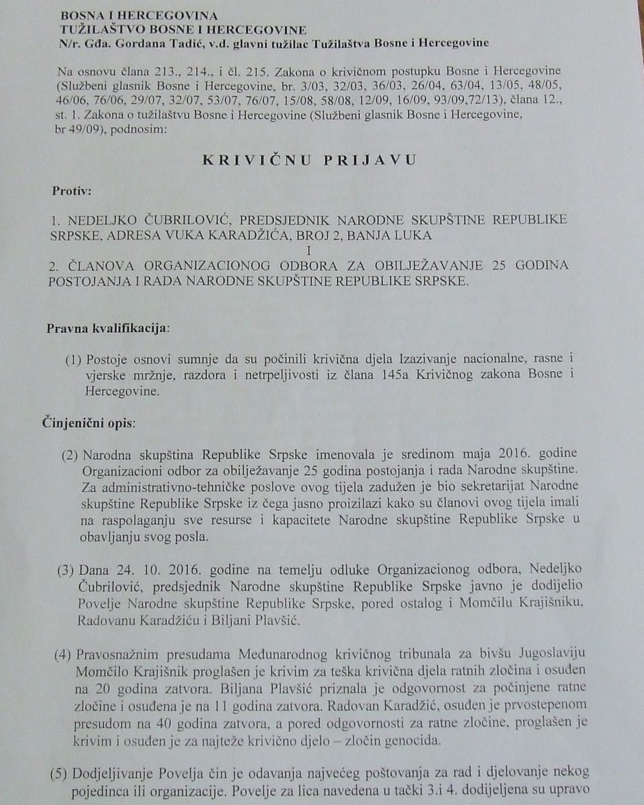 "Pravna kvalifikacija je da su Čubrilović i članovi Organizacionog odbora počinili krivično djelo Izazivanja nacionalne, rasne i vjerske mržnje i netrpeljivosti, član 145. Krivičnog zakona BiH", naglasio je Alić.