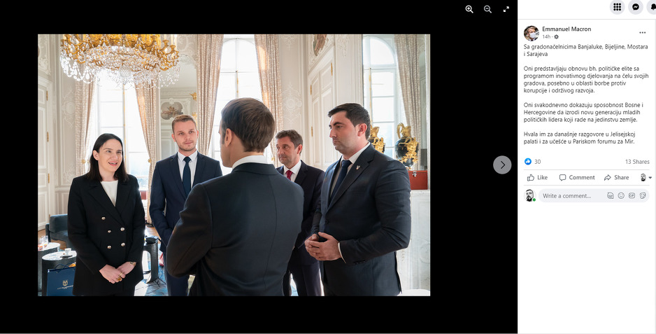 "Oni predstavljaju obnovu bh. političke elite s programom inovativnog djelovanja na čelu svojih gradova, posebno u oblasti borbe protiv korupcije i održivog razvoja. Oni svakodnevno dokazuju sposobnost Bosne i Hercegovine da izrodi novu generaciju mladih političkih lidera koji rade na jedinstvu zemlje", poručio je Macron.