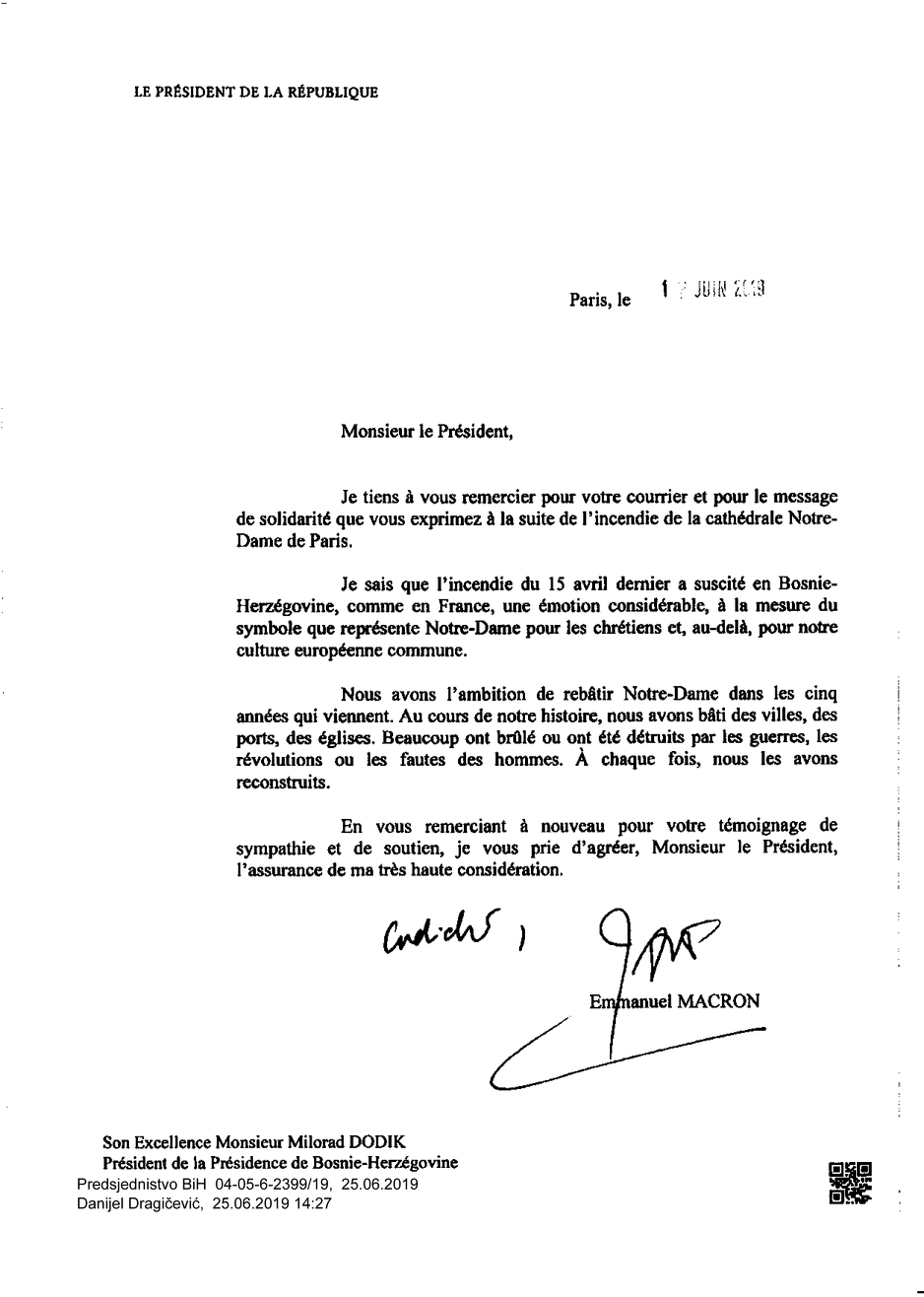 "Znam da je požar, koji se dogodio 15. aprila, izazvao izuzetne emocije u BiH, kao i u Francuskoj u skladu sa simbolom koji predstavlja Notre Dam za hrišćane i našu zajedničku evropsku kulturu", istakao je Macron u pismu zahvalnosti upućenom predsjedavajućem Predsjedništva BiH.