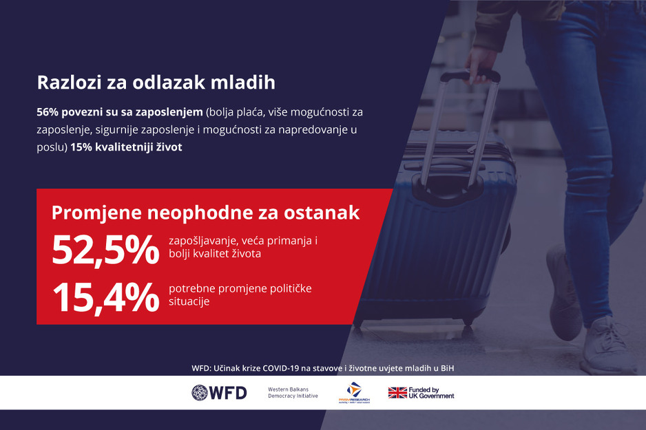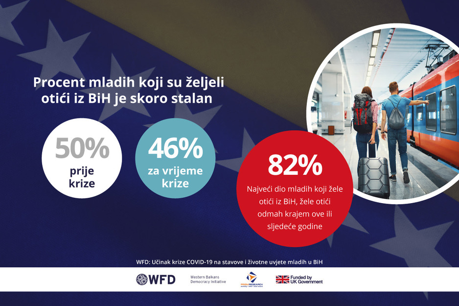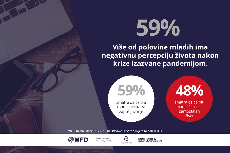 Čak 70 posto mladih su naveli da je pandemija negativno utjecala na obrazovanje, a više od polovine mladih ima negativnu percepciju života nakon pandemije i smatraju da će biti manje prilika za zapošljavanje. Zabrinjavanjućih 82 posto njih žele napustiti BiH krajem ove ili početkom naredne godine.