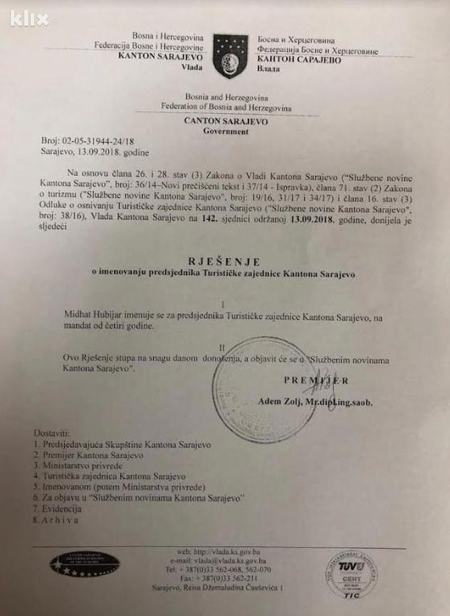 Odluka o imenovanju na poziciju čiji je mandat četiri godine donesena je na 142. sjednici Vlade Kantona Sarajevo, a potpisuje je premijer Kantona Sarajevo Adem Zolj.