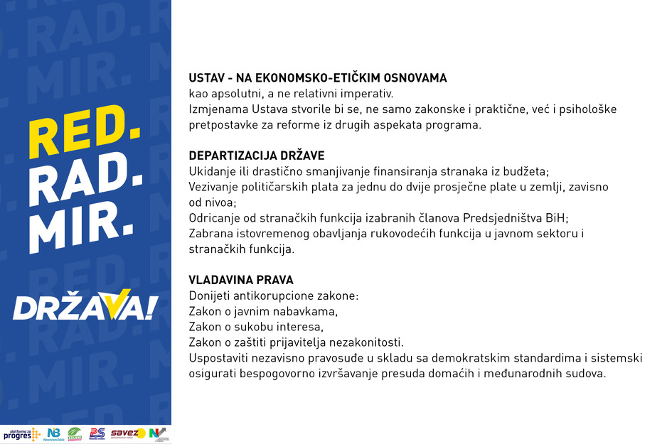 "Reforme trebaju počivati na ekonomsko-etičkim osnovama, kao apsolutni, a ne relativni imperativ. Izmjenama bi se stvorile ne samo zakonske i praktične, već i psihološke pretpostavke za reforme i drugih aspekata. Predlažemo i 'departizacija' države i institucija, te ukidanje ili drastično smanjivanje finansiranja stranaka iz budžeta; odricanje od stranačkih funkcija izabranih članova Predsjedništva BiH; zabrana istovremenog obavljanja rukovodećih funkcija u javnom sektoru i stranačkih funkcija".