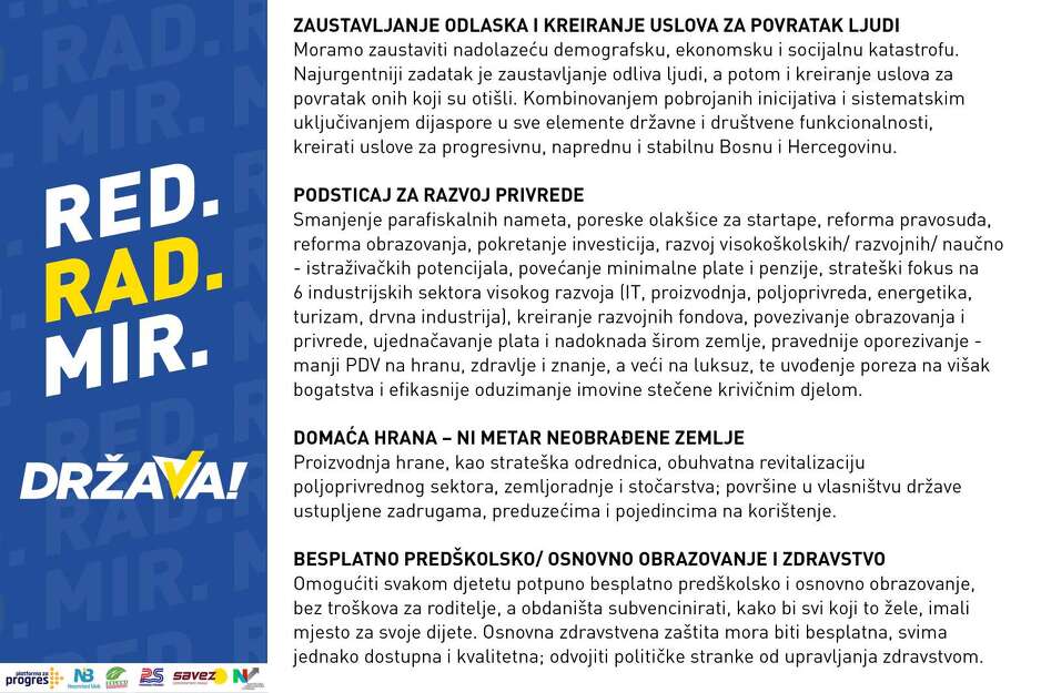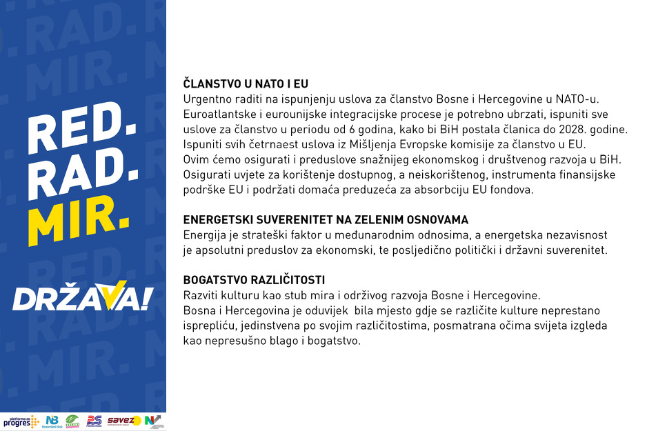 "Dođe vrijeme kada se mora odučiti da li da ostanemo u prošlosti, u neredu, neradu i nemiru, ili da se okrenemo budućnosti – redu, radu i miru. Funkcija države je da obezbijedi pravednost, ekonomski razvoj i sigurnost. Naš slogan to reflektuje. Mi smo imali hrabrosti da napravimo zajedničke liste za sve nivoe vlasti i na zajedničkim programskim načelima i ciljevima. Ne želimo poput drugih svoju nemoć i neznanje pravdati grešakama postojećeg režima. Mi znamo ko smo i šta možemo učiniti za državu i građane. Zato smo drugačiji i zato vjerujemo da će to građani prepoznati na izborima. Kad nas pitaju ko smo mi, šta predstavljamo, šta nudimo ljudima – red, rad, mir", kazao je Mirsad Hadžikadić.
