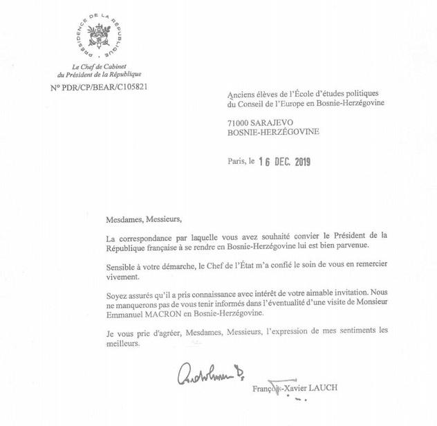 "Dirnut vašim postupkom, šef države me je zadužio da vam se srdačno zahvalim. Budite uvjereni da je vaš ljubazni poziv primio na znanje i sa zainteresovanošću. Nećemo propustiti da vas obavijestimo o eventualnoj posjeti Emmanuela Macrona Bosni i Hercegovini. Molim vas da primite naše srdačne pozdrave", navedeno je u poruci šefa Macronovog kabineta.
