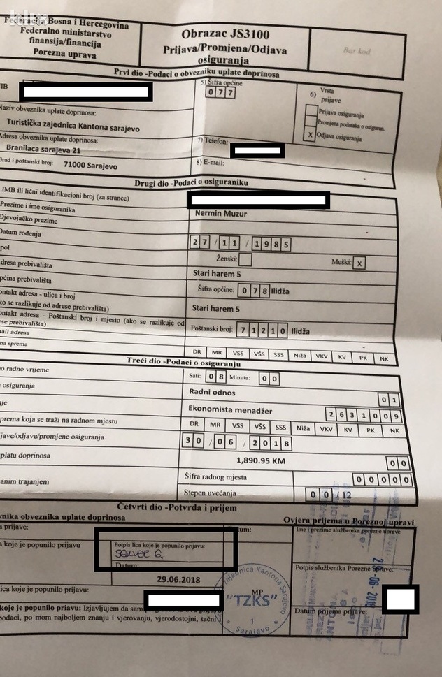 "Kada sam dobio taj dokument mislio sam da je sve završeno. Nakon nekoliko dana nazvao me knjigovođa iz računovodstvene agencije, kazavši da su ga zvali iz Porezne uprave i kazali mu da je nemoguće odjaviti Nermina Muzura jer je nepotpuna dokumentacija koju su predali. Postalo mu je sumnjivo jer nisu ništa predavali za odjavu. Ja sam mislio da sam već odjavljen, jer sam dobio papir. Kad sam bolje pogledao papir, zajedno s knjigovođom, uvidjeli smo da ga je neko potpisao, odnosno da je dokument krivotvoren", kazao je Muzur za Klix.ba.