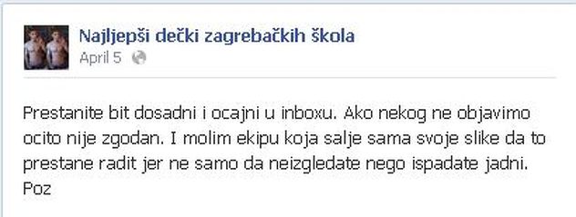Stranica pod nazivom "Najljepši dečki zagrebačkih škola" ima blizu 10.000 lajkova, osnovana je 14. marta ove godine i u opisu stranice se pozivaju dječaci da šalju fotografije.
