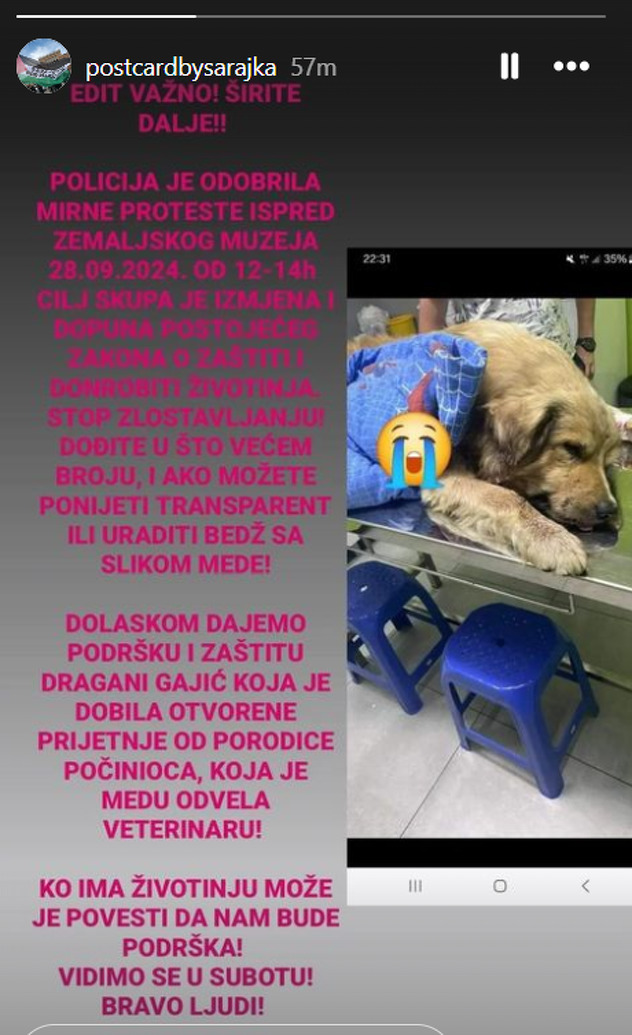 "Cilj skupa je je izmijena i dopuna postojećeg zakona o zaštiti i dobrobiti životinja, stop zlostavljanju! Dođite u što većem broju i ako možete ponijeti transparent ili uraditi bedž sa slikom Mede", stoji u pozivu koji se dijeli društvenim mrežama.