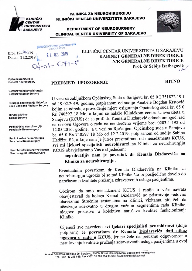 Tim povodom u kabinet generalne direktorice KCUS-a Sebije Izetbegović, kako su saopćili, stiglo je upozorenje stručnog kolegija Klinike za neurohirurgiju, u kojem upozoravaju menadžment da će u slučaju povratka Kemala Dizdarevića na Kliniku za neurohirurgiju KCUS svi ljekari specijalisti neurohirurzi podnijeti zahtjev za otkaz Ugovora o radu.