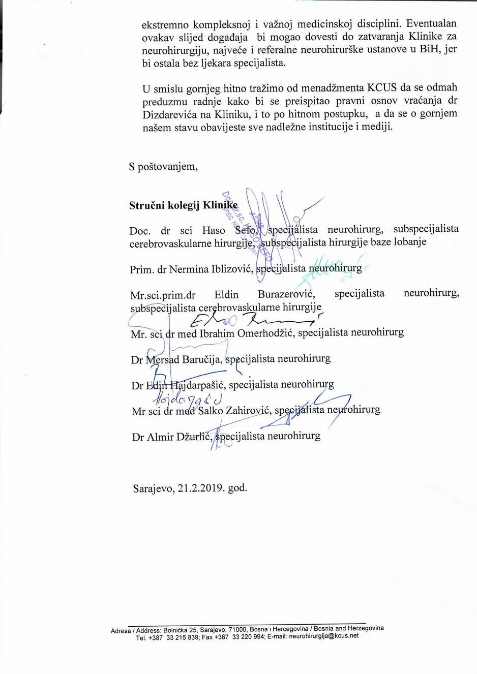 Stručni kolegij Klinike za neurohirurgiju u navedenom dopisu navodi da bi povratak Kemala Dizdarevića na ovu kliniku ozbiljno ugrozio rad, što bi za posljedicu imalo narušavanje kvalitete pružanja zdravstvenih usluga pacijentima.