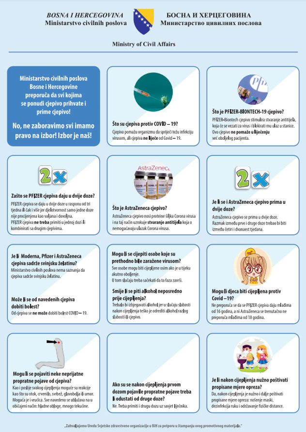 Ministarstvo civilnih poslova BiH preporuča da svi kojima se ponudi vakcina prihvate i imuniziraju se uz važnu napomenu „Ne zaboravimo svi imamo pravo na izbor! Izbor je naš!“.