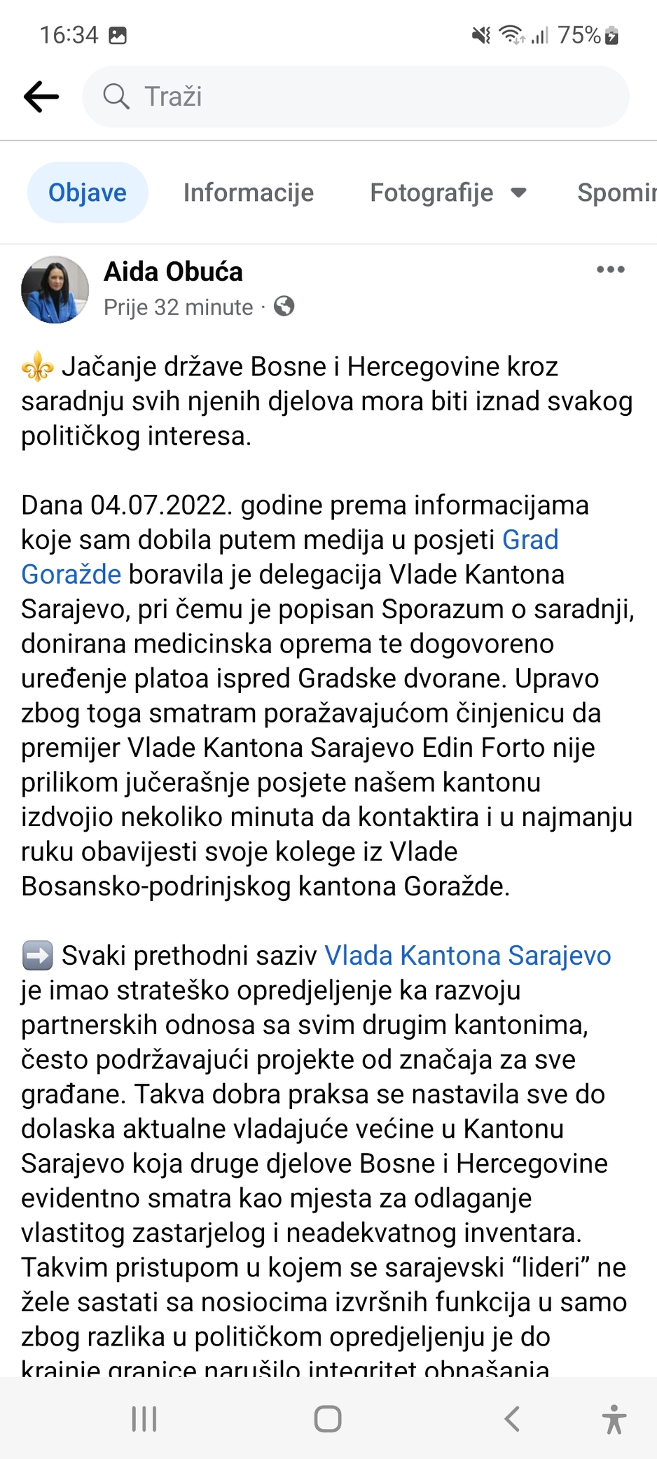 "Smatram poražavajućom činjenicu da premijer Vlade Kantona Sarajevo Edin Forto nije prilikom jučerašnje posjete našem kantonu izdvojio nekoliko minuta da kontaktira i u najmanju ruku obavijesti svoje kolege iz Vlade BPK Goražde. Svaki prethodni saziv Vlade Kantona Sarajevo je imao strateško opredjeljenje ka razvoju partnerskih odnosa sa svim drugim kantonima, često podržavajući projekte od značaja za sve građane. Takva dobra praksa se nastavila sve do dolaska aktualne vladajuće većine u Kantonu Sarajevo koja druge dijelove Bosne i Hercegovine evidentno smatra kao mjesta za odlaganje vlastitog zastarjelog i neadekvatnog inventara. Takvim pristupom u kojem se sarajevski "lideri" ne žele sastati sa nosiocima izvršnih funkcija samo zbog razlika u političkom opredjeljenju je do krajnje granice narušilo integritet obnašanja izvršne vlasti. Smatram da je ovakva stranačka privatizacija organa krajnje neprimjerena i nedemokratska", napisala je Obuća.