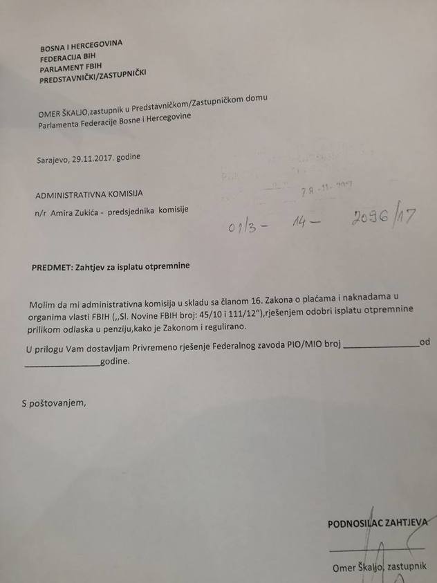 Omer Škaljo iz SDA tražio 15.000 KM otpremnine od Parlamenta FBiH