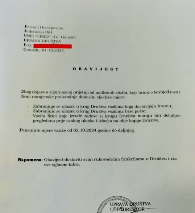 U obavijesti se navodi da je od 2.10.2024. godine pa do daljnjeg zabranjen ulazak u krug objekata vojne industrije vozilima koja dostavljaju hranu i vozilima brze pošte. Vozila firmi koje izvode radove u krugu objekta moraju biti detaljno pregledana prije svakog ulaska i izlaska.