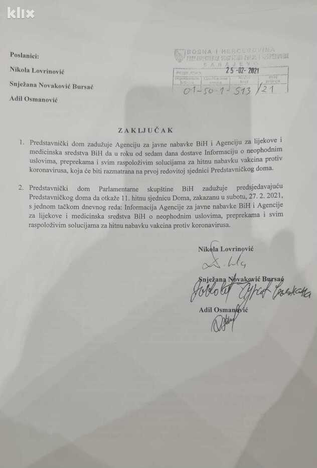 Usvojen je zaključak parlamentaraca Nikole Lovrinovića iz Hrvatske demokratske zajednice (HDZ), Snježane Novaković-Bursać iz Saveza nezavisnih socijaldemokrata (SNSD) i Adila Osmanovića iz Stranke demokratske akcije (SDA) da Zastupnički dom zaduži Agenciju za javne nabavke i Agenciju za lijekove da u roku od sedam dana dostave informaciju o neophodnim uslovima, preprekama i svim raspoloživim rješenjima za hitnu nabavku vakcina protiv koronavirusa, a koja će biti razmatrana na prvoj redovnoj sjednici.