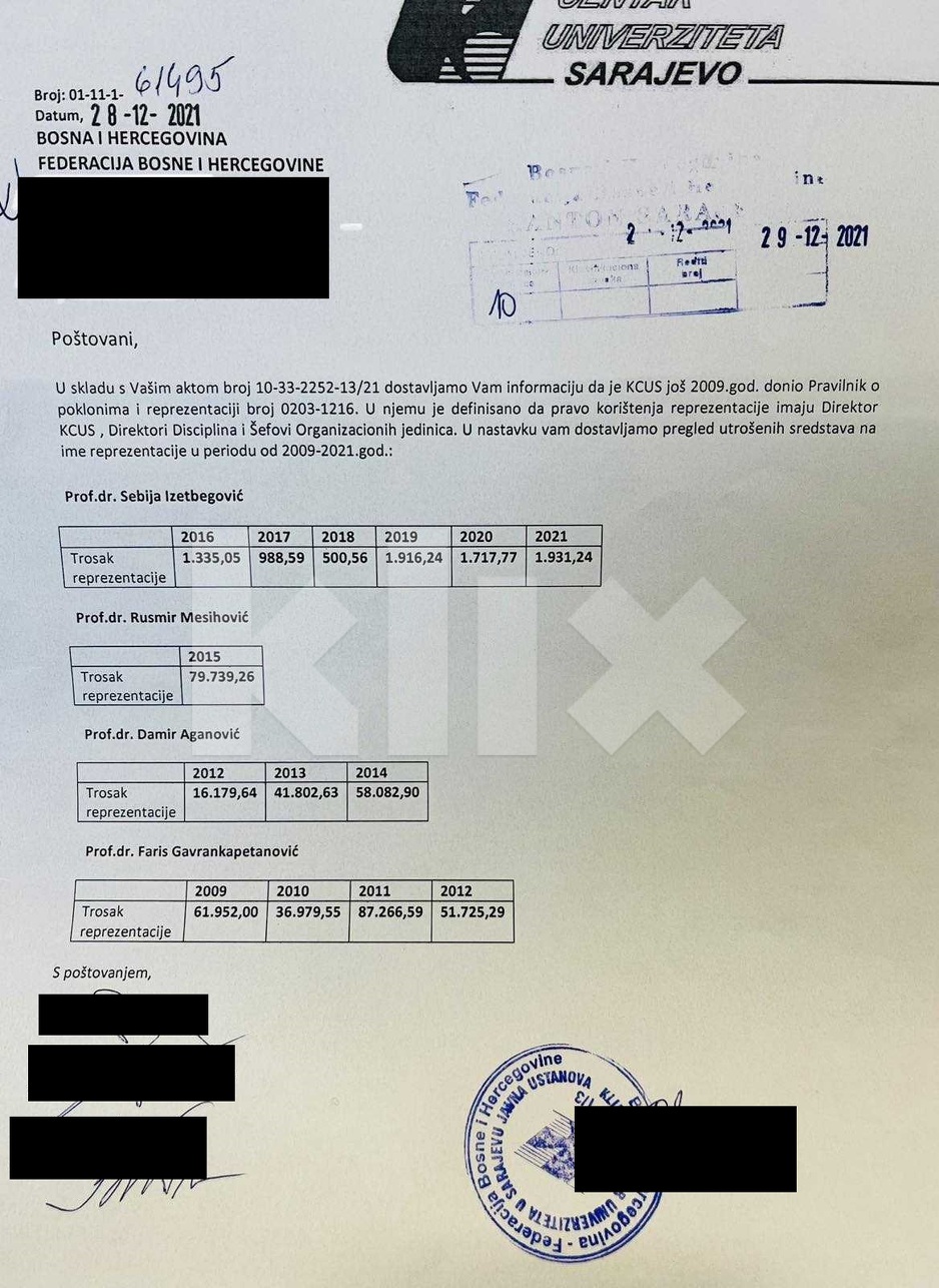 Značajan iznos za reprezentaciju potrošen je u 2015. godini kad je direktor KCUS-a bio doktor Rusmir Mesihović. Dokument koji je poslan ministarstvu prikazuje iznos od čak 79.739 KM u ovoj godini.