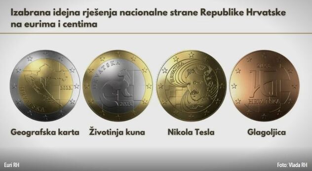 Na kovanici od 2 eura motiv će biti geografska karta Hrvatske, na 1 euru motiv kune, na kovanicama od 50, 20 i 10 centi lik NIkole Tesle, a na kovanicama od pet, dva i jednog centa slova HR ispisana na glagoljici, a na svim kovanicama će biti i elementi šahovnice.