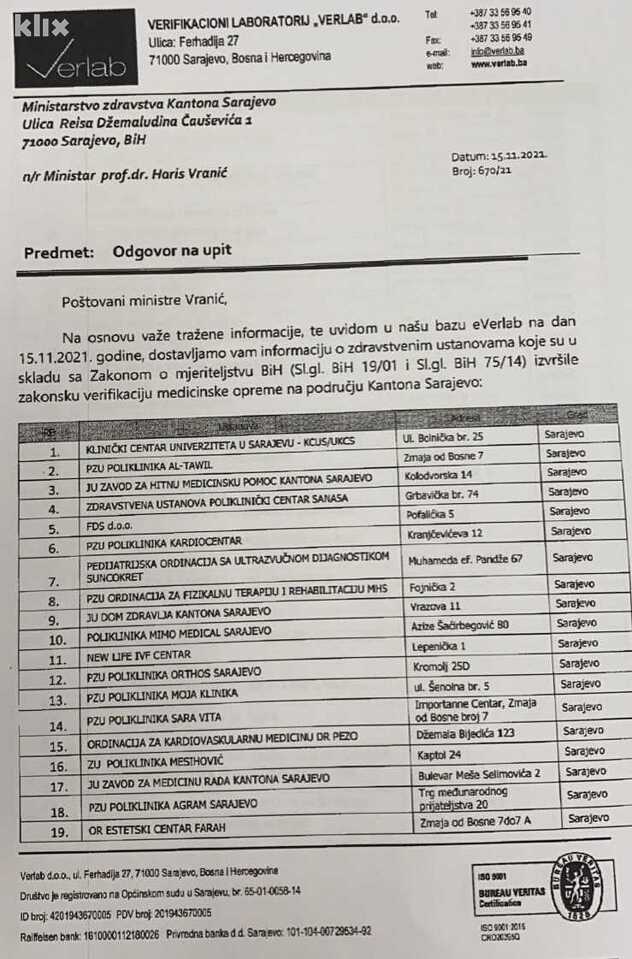 Objavljivanje spiska uslijedilo je nakon što je ministar zdravstva KS Haris Vranić zatražio informacije o tome koje su ustanove u skladu sa zakonom izvršile verifikaciju medicinske opreme u ovom kantonu.