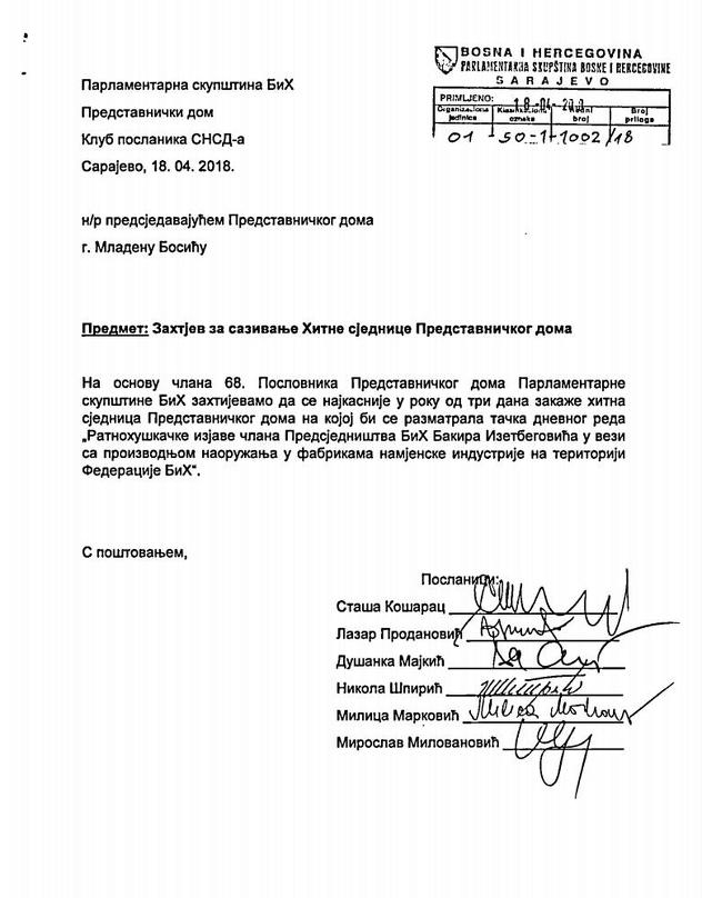 Na zvaničnoj web stranici Parlamentarne skupštine BiH već je najavljena 8. hitna sjednica Zastupničkog doma PSBiH sa samo jednom tačkom dnevnog reda, a koja glasi: "Ratnohuškačke izjave člana Predsjedništva BiH Bakira Izetbegovića u vezi s proizvodnjom naoružanja u fabrikama namjenske industrije na teritoriji Federacije BiH".