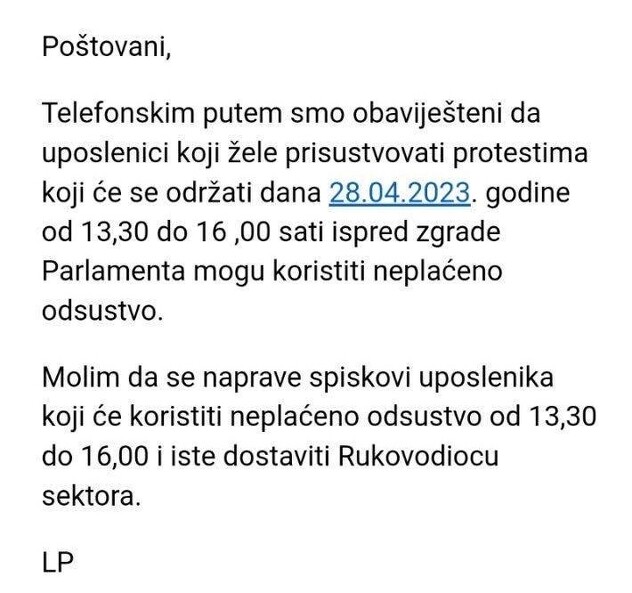 Društvenim mrežama u isto vrijeme kruži više različitih screenshotova e-maila koje je navodno poslalo rukovodstvo KCUS-a svojim uposlenicima, a u kojem se kaže da svi oni koji žele otići na proteste od 13:30 do 16:00 sati mogu uzeti neplaćeno odsustvo.