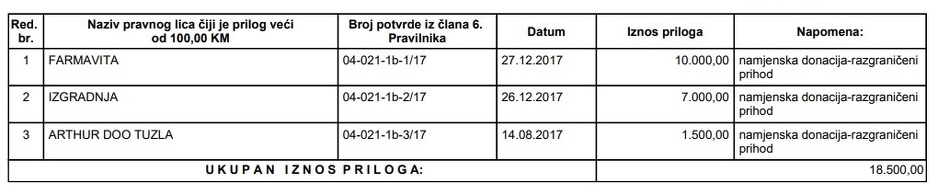 Podrška SDA nije izostala ni od pravnih subjekata pa je Farmavita uplatila 10.000 KM, Izgradnja 7.000 KM, a Arthur 1.500 KM.