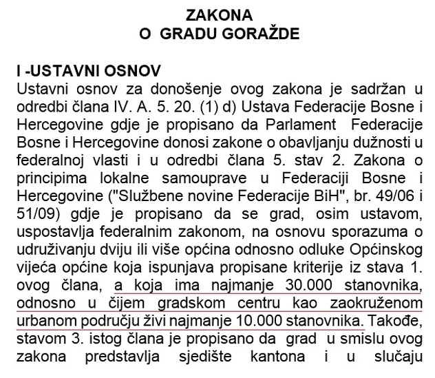 Uprkos neispunjavanju uslova o ukupnom broju od 30.000 stanovnika, u nastavku jednog od tri predložena zakona se navodi da Općina Goražde ispunjava neophodne uslove za proglašenje gradom, kao i da u zaokruženom urbanom području živi najmanje 10.000 stanovnika. Prema zakonu, izuzeci su općine koje su sjedište kantona.