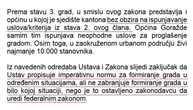 Dodaje da Goražde ispunjava uslove iz Zakona o principima lokalne samouprave, ali da status grada zaslužuju i po svom privrednom i kulturnom napretku u urbanističkom, ali i u svakom drugom smislu.
