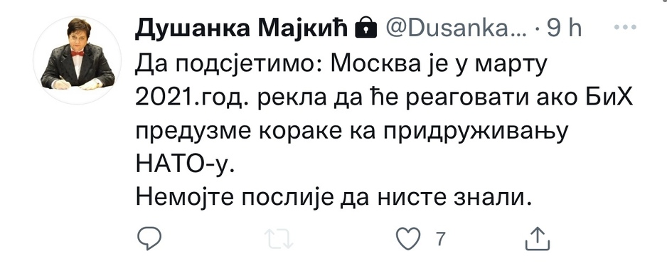 Delegatkinja u Domu naroda Parlamentarne skupštine Bosne i Hercegovine i članica SNSD-a Dušanka Majkić komentarisala je danas mogući ulazak BiH u NATO u pogledu stava Rusije prema tome.